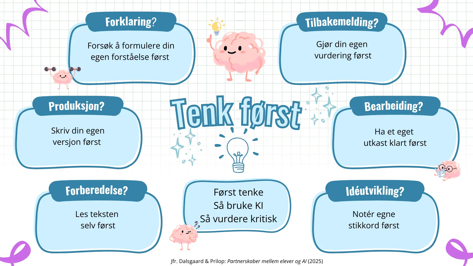 Et gjennomgående prinsipp for læringsfremmende KI-bruk er tenk først: Eleven bør alltid produsere et eget utkast, en idé eller en disposisjon før KI tas i bruk. Forskning viser at elever som forsøker å løse en oppgave selv før de søker hjelp, husker og lærer bedre enn dem som går rett til et verktøy.